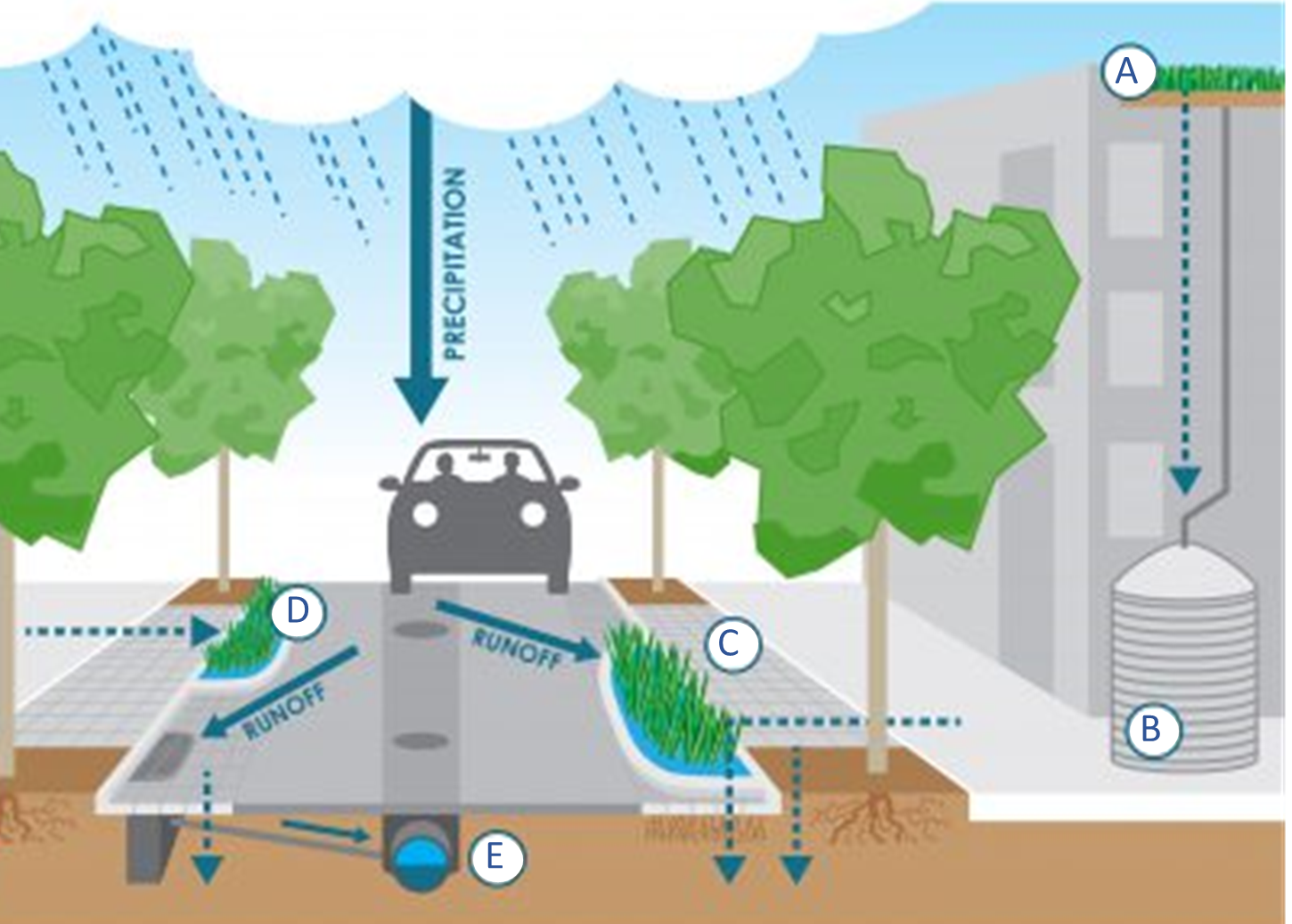 A GSI treatment train is the application of multiple GSI in sequence. One example of this is the sequence of a green roof, rain barrel, permeable pavement, bioretention, and sewer (Figure 6). Rain and runoff will be channeled from one GSI practice into the next, allowing for greater runoff storage, infiltration, and treatment than a single GSI could achieve on its own. Treatment trains provide stormwater capture and treatment redundancy, thereby improving the ability to capture increased rainfall anticipated under climate change.