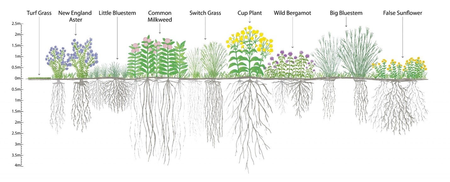 Establishing healthy vegetation in GSI is a key component to enhancing infiltration and detention in GSI. Infiltration can be enhanced by the active roots creating macropores through which water can infiltrate and by dead roots providing organic matter to the soil and improving the integrity of the soil matrix. Deep rooted vegetation can be particularly favorable to infiltration. Certain grasses, shrubs, rushes, and forbs are among the plants that can have deep roots. Prairie species particularly, which have adapted and developed to recover from fires and other events, tend to have deep roots. These species may be sensitive to shading and, if planted beneath larger shrubs or trees, their growth may be inhibited (Shaw and Schmidt, 2003). A USGS study found that the median infiltration rate of clay soil planted with prairie species was more than three times the rate of clay soil planted in turf (0.88 vs 0.28 inches/hour) (Selbig, 2010). Additionally, leafy vegetation can shelter the soil beneath it by dissipating some of the energy of rain drops before they reach the soil surface and preventing crust formation (i.e., the formation of a compacted, poorly infiltrative layer at the top of the soil surface) on bare soil (Alizadehtazi et al., 2019).