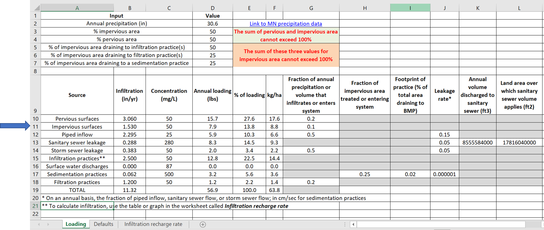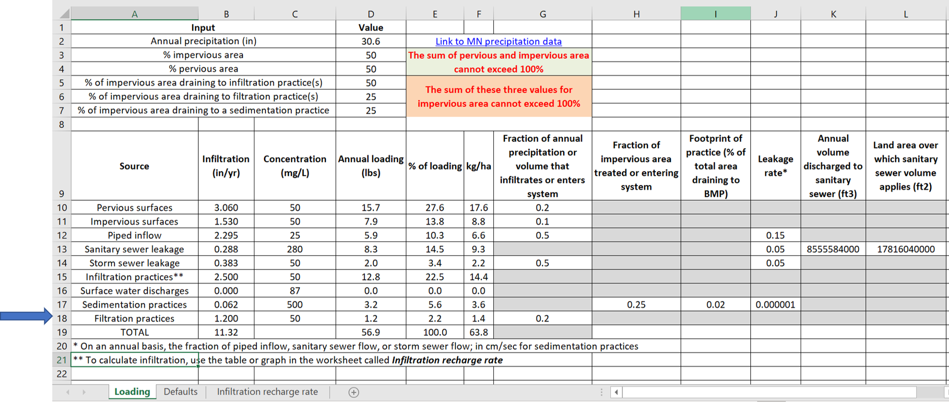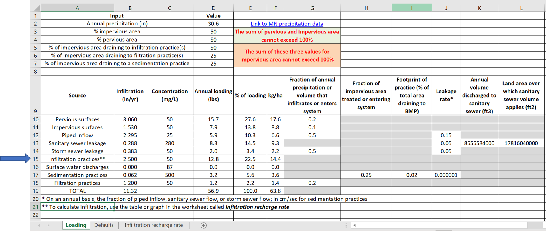 - Row E: Percent of the impervious area draining to infiltration practice(s). Infiltration practices are practices with no underdrain and that are designed to capture and infiltrate a specified amount of stormwater runoff. The user enters the value in cell E4. The value may range from 0 (no infiltration practices) to 100 (all runoff from impervious surfaces drains to infiltration practices).