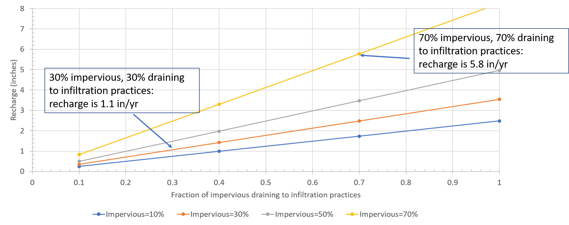 - 30 percent impervious and 30 percent draining to infiltration practices, giving a recharge rate of about 1.1 inches per year