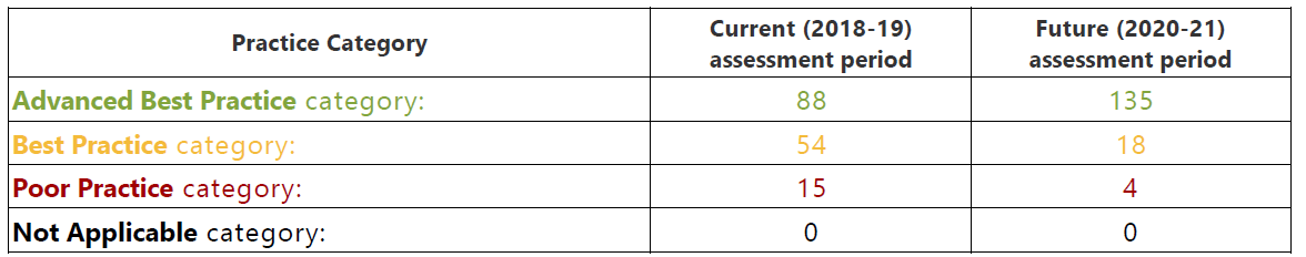 The assessment consists of a series of multiple-choice questions that cover all aspects of winter maintenance operations, such as policy, storage, application, and education. Each answer for a question is classified as an Advanced Best Practice (green), Average Best Practice (yellow), or Below Average Practice (red). The BMP Summary Report indicates how many different types of practices (advanced, best, poor, not applicable) practices you are currently implementing and how many you plan to implement in the future. The BMP list report provides detailed information on current practices. This report could be used to help you prioritize what poor practices you want to work on improving in the coming years.