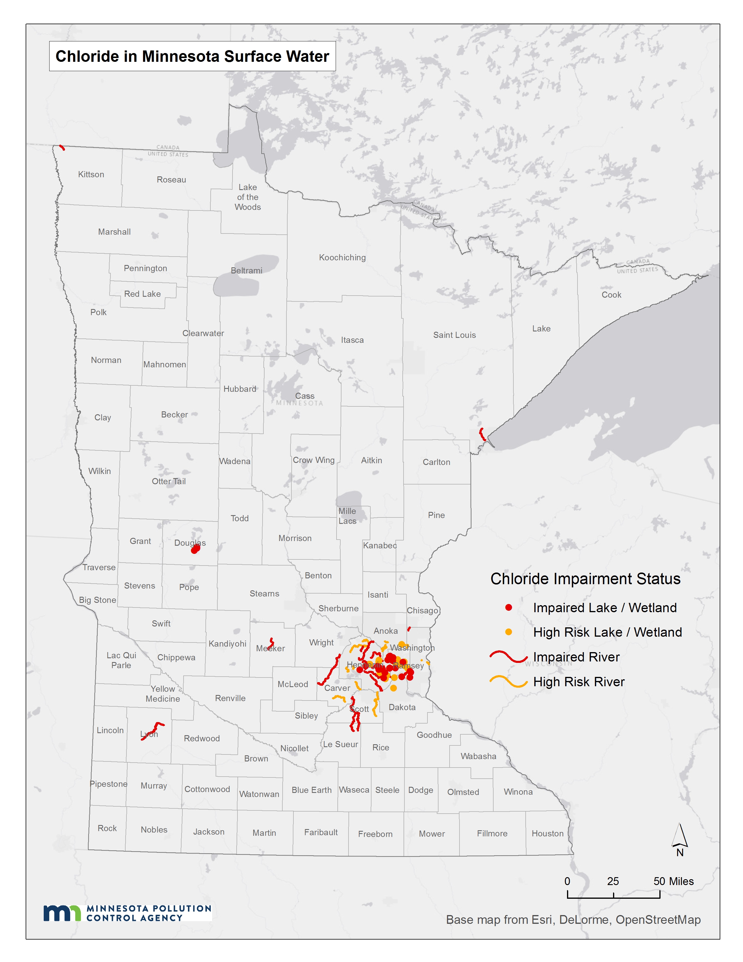 There are currently 40 lakes and streams in the Twin Cities Metro Area that are impaired by chloride. There are an additional 10 lakes and streams that are impaired by chloride in greater Minnesota. See the MPCA’s chloride webpage for more information on the sources of chloride, environmental impacts, and opportunities for your community to reduce salt.