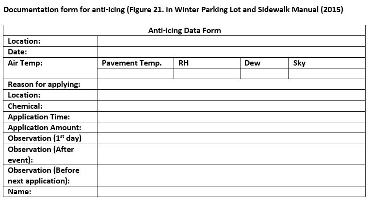 The Minnesota Snow and Ice Control Field Handbook for Snowplow Operators includes examples of salt tracking forms that could be used (see Appendix). The Winter Parking Lot and Sidewalk Manual also includes tracking forms for anti-icing and de-icing (see adjacent images).