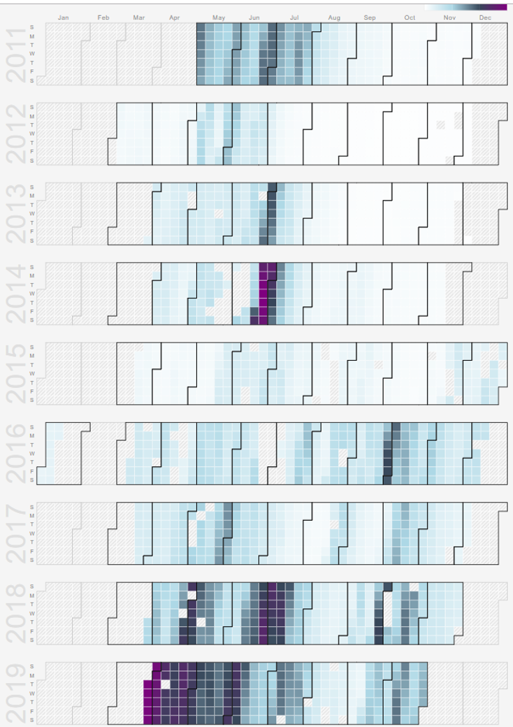 - Streamflow does not always correlate with precipitation. For example, the highest flows in streams and rivers, on an average annual basis, occur in early to mid-spring, while rainfall is greatest and rainfall intensities highest in late spring and early summer. In addition, peak stormwater runoff in early- to mid-spring typically occurs over a period of several days to weeks as snow melts. Stormwater BMPs are designed to manage this type of runoff, resulting in maximum BMP effectiveness during high stream flows. Conversely, intense rains in late spring and summer often overwhelm stormwater BMPs. Typically, streamflows decrease during this time period, meaning stormwater BMPs are often less effective in middle flow regimes (Baldwin and Lall, 1999; Zheng et al., 2018)