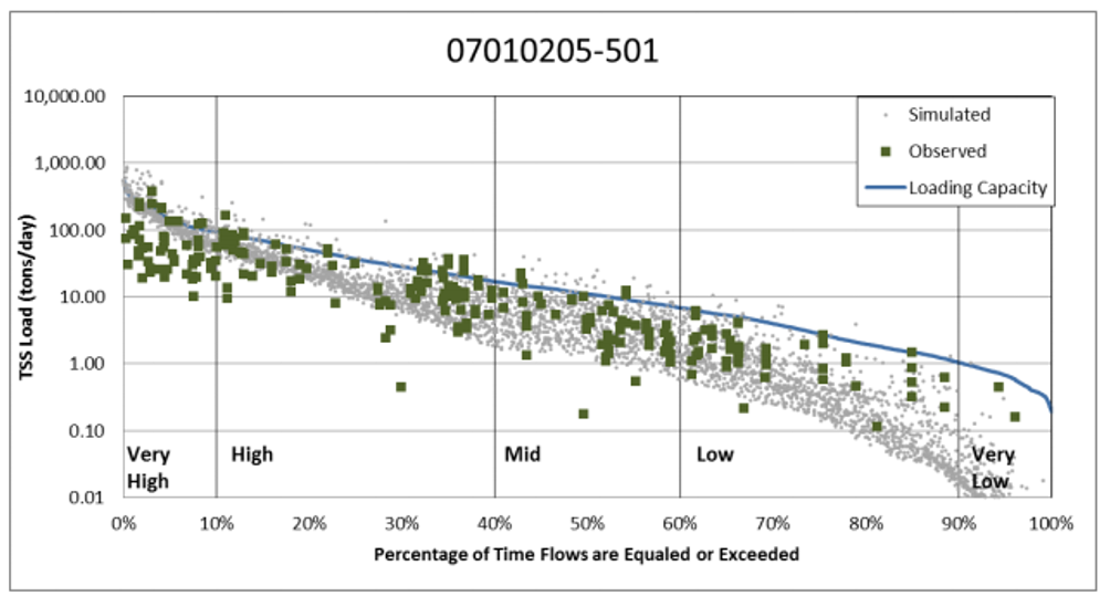 For total maximum daily loads (TMDLs), load duration curves are primarily used for total suspended solids (TSS) and fecal bacteria (total fecal coliforms or E. coli). Typically, five flow or load regimes are used (very low, low, mid, high, and very high). The specific flows that these correspond with can vary. For example, in the adjacent image, very low and very high correspond with the lowest and highest 10 percent of flows, respectively, mid flows correspond with flows in the 40-60 percent range, and high and low flows correspond with 10-40 and 60-90 percent of the flows, respectively.