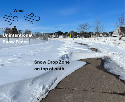 An unintentional snow fence is anything that is placed in the path of the winter wind that causes a reduction in wind speed resulting in a snow drop. This could be park benches, landscaping, decorative fencing, sports field fencing, and other structures.