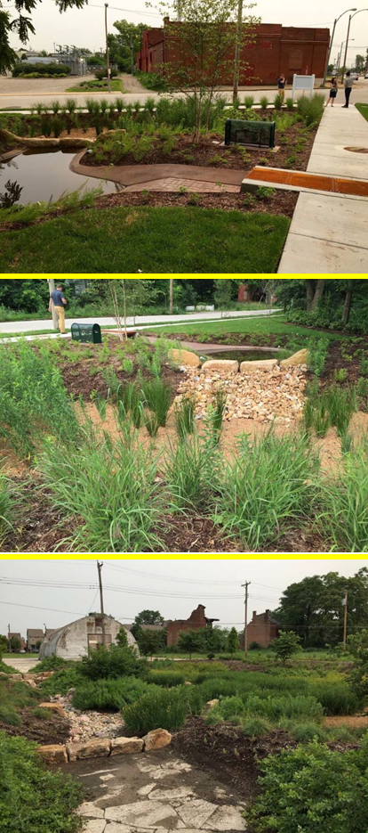 Images of forebays, which temporarily detain water prior to being delivered to the permanent treatment practice. The detention allows settling of solids. Photos courtesy of Melissa Kramer.