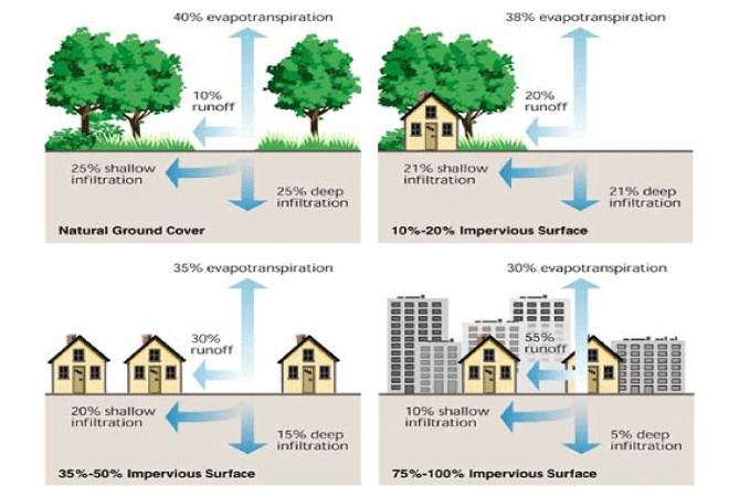 The increase in impervious surfaces can disrupt the natural water cycle and alter the surrounding environment via the decrease of groundwater recharge and the increase of water directly flowing to surface waters. As a likely consequence, this can lead to a reduction in the baseflow of streams, a decrease in the elevation of the groundwater table, and transport of sediment and pollutant loads into surface waters. A more detailed explanation of stormwater runoff and its effects on the environment can be found here.