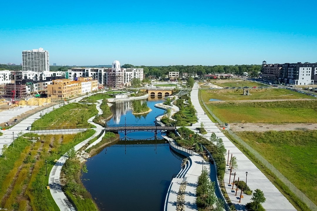 The Highland Bridge project (formerly Ford Redevelopment Site) is the redevelopment of roughly 122 acres of land along the Mississippi River in Saint Paul, MN that was previously home to Ford’s Twin Cities Assembly Plant. This redevelopment project converted the industrial land to residential and commercial space, including 55 acres of parks, open spaces, and waterways. This project is unique in that it uses a non-conventional stormwater management system called the “Hidden Falls Headwaters approach”. In this novel approach, stormwater from the site is captured and treated by green stormwater infrastructure (GSI), stored in concrete chambers, and eventually filtered and delivered to the Hidden Falls Creek and the site’s central water feature, a meandering open water channel surrounded by green space. This approach also daylighted and re-established the historic Hidden Falls Creek which had been previously buried and paved over.
