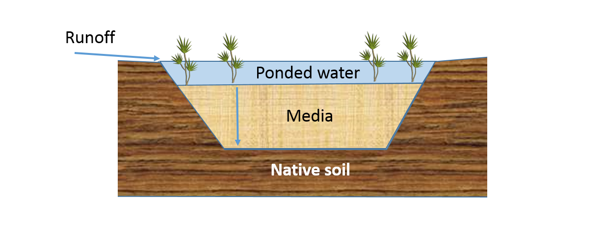 Water from an impervious surface is routed to the rain garden, where it ponds until the basin is full or runoff stops. Examples of how water is routed to a rain garden include a cut in a street curb to allow water to enter or direct discharge from a roof gutter. The ponded water soaks through the media and either percolates down into the underlying native soil, or is captured by the underdrain and returned to the storm sewer system. The ponded water must all drain within a day or two so that plants do not remain inundated with water and to create space for the next rain event.