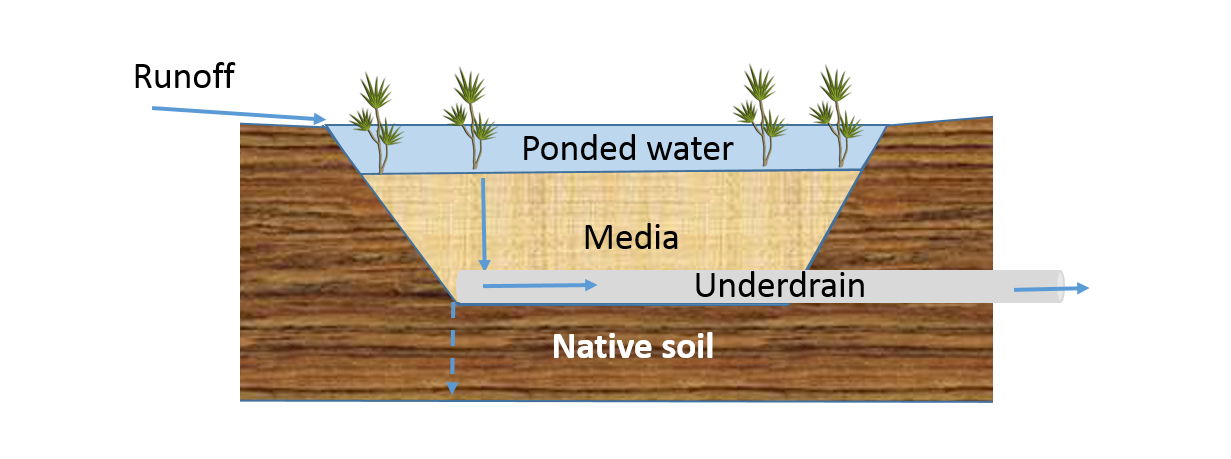 Rain gardens, also called bioretention basins, are planted depressions that collect stormwater runoff from impervious surfaces, such as roofs and streets, and filter pollutants out of the runoff water. There are two basic types of rain gardens, as shown on the right. Rain gardens with no underdrain allow captured runoff water to infiltrate into the underlying soil. They are therefore effective at removing water and pollutants. Rain gardens that have an underdrain filter pollutants, but most of the filtered water is captured by the drain and returned to the storm sewer system, where it will eventually be discharged to a lake or river.