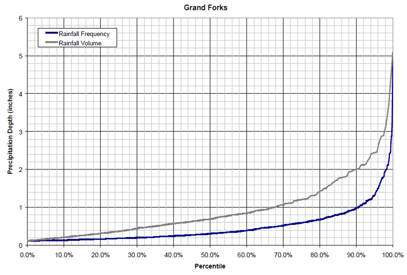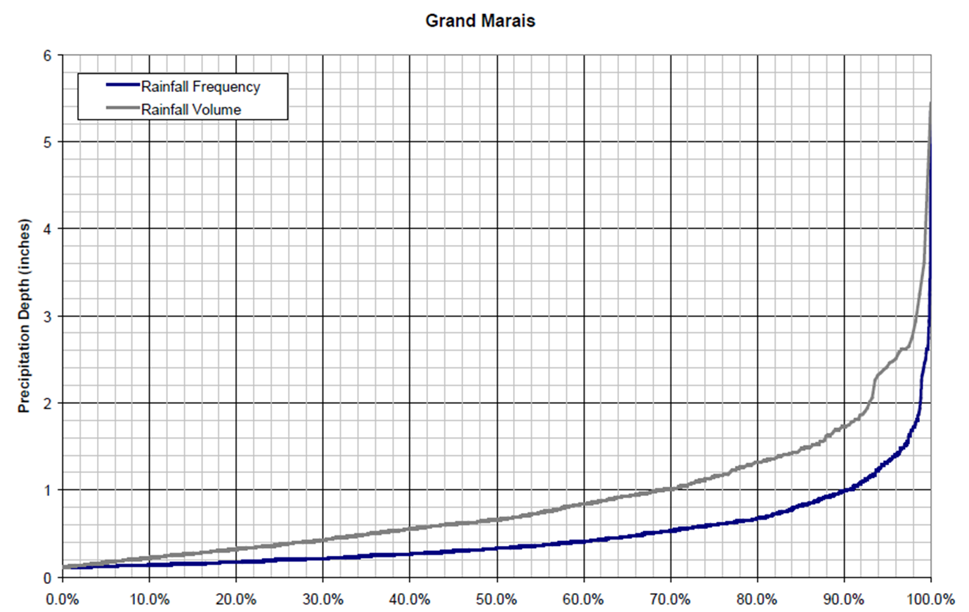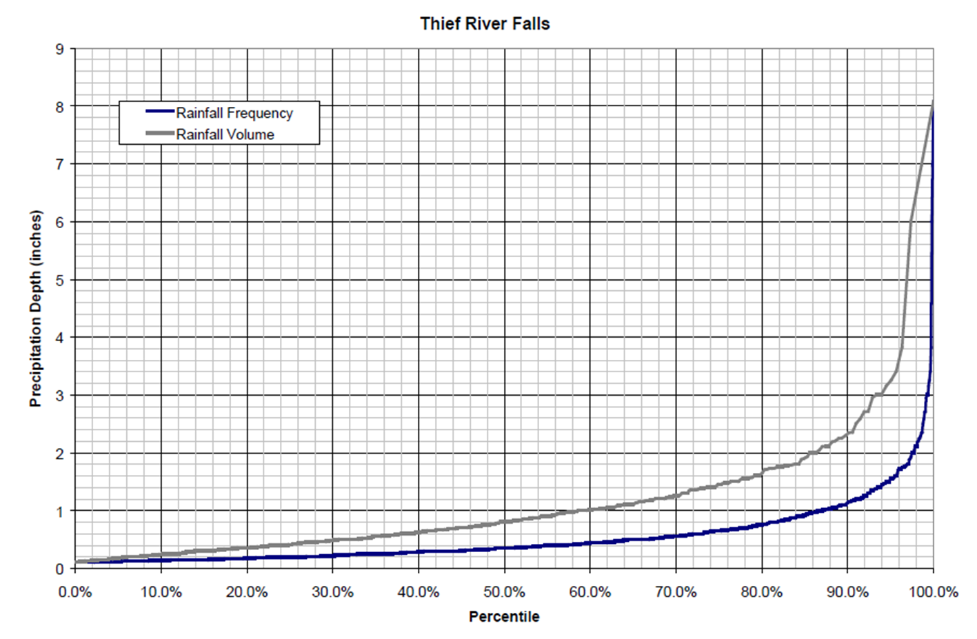 In the development of rainfall frequency and volume data for Minnesota, the Minnesota Stormwater Manual Sub-Committee conducted an analysis of rainfall distribution for several locations in Minnesota. The methodology and results of this analysis are described in Issue Paper B. Frequency-volume graphs were developed for several locations in the state and are illustrated below.