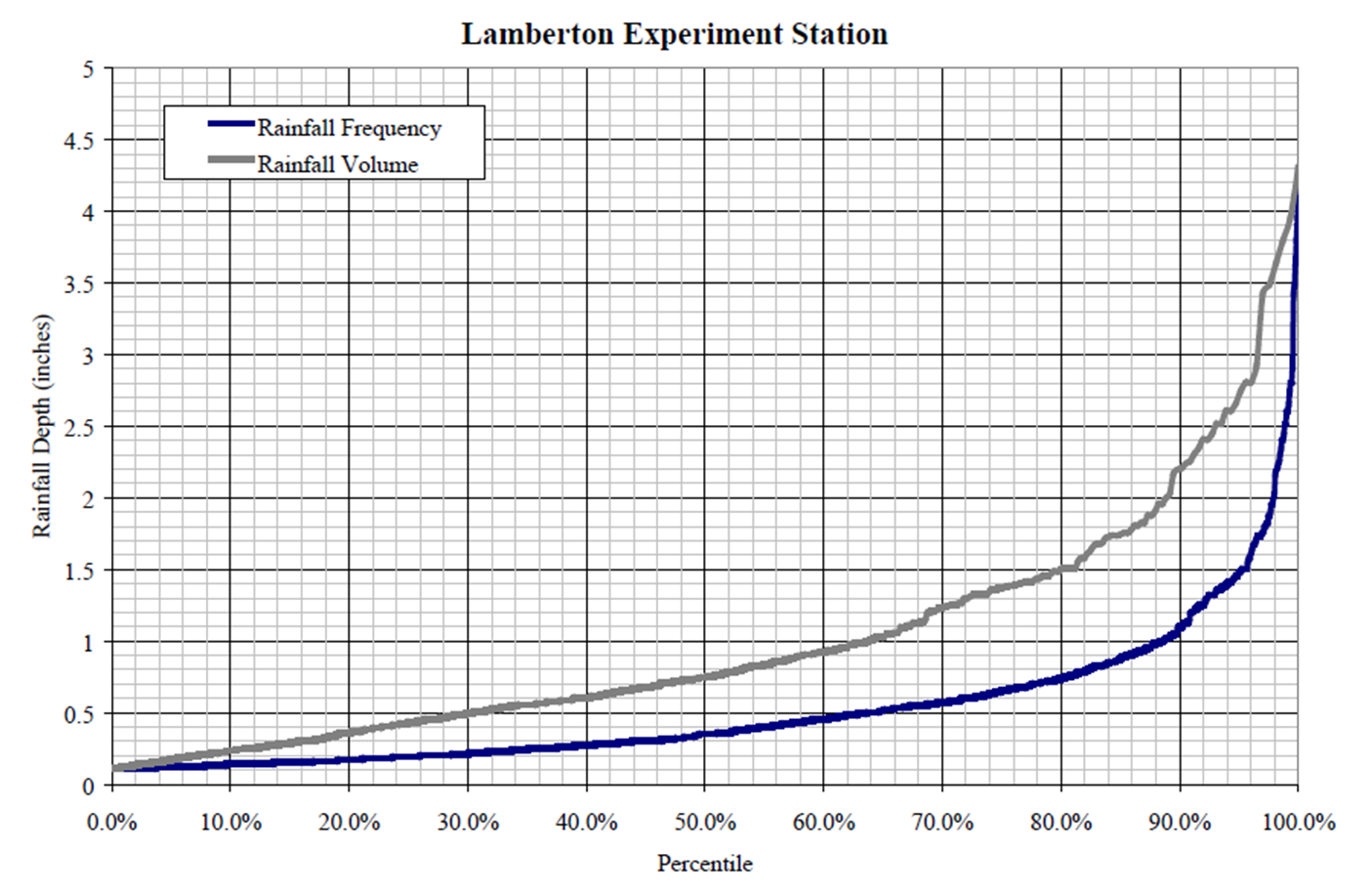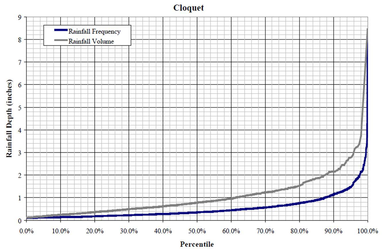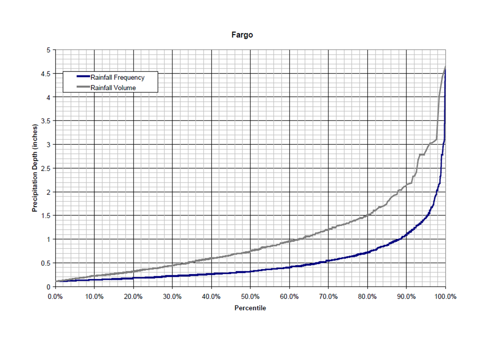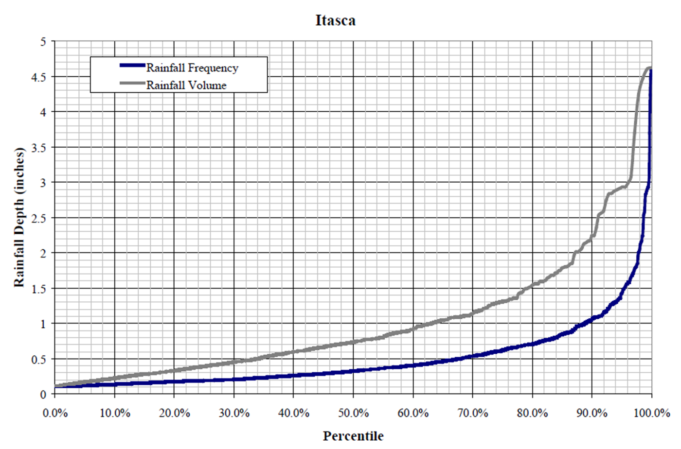In the development of rainfall frequency and volume data for Minnesota, the Minnesota Stormwater Manual Sub-Committee conducted an analysis of rainfall distribution for several locations in Minnesota. The methodology and results of this analysis are described in Issue Paper B. Frequency-volume graphs were developed for several locations in the state and are illustrated below.