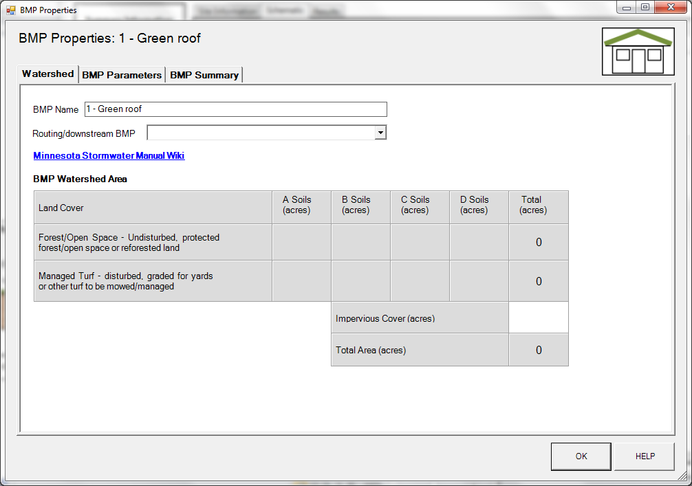 Step 5: If help is needed, click on the Minnesota Stormwater Manual Wiki link or the Help button to review input parameter specifications and calculation specific to the Green roof BMP.