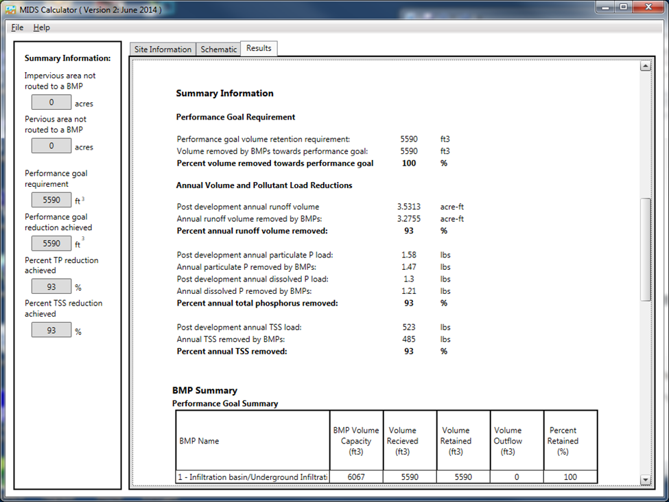 - BMP Summary Tab: The BMP Summary tab summarizes the volume and pollutant reductions provided by the specific BMP. It details the performance goal volume reductions and annual average volume, dissolved P, particulate P, and TSS load reductions. Included in the summary are the total volume and pollutant loads received by the BMP from its direct watershed, from upstream BMPs and a combined value of the two. Also included in the summary, are the volume and pollutant load reductions provided by the BMP, in addition to the volume and pollutant loads that exit the BMP through the outflow. This outflow load and volume is what is routed to the downstream BMP if one is defined in the Watershed tab. Finally, percent reductions are provided for the percent of the performance goal achieved, percent annual runoff volume retained, total percent annual particulate phosphorus reduction, total percent annual dissolved phosphorus reduction, total percent annual TP reduction, and total percent annual TSS reduction.