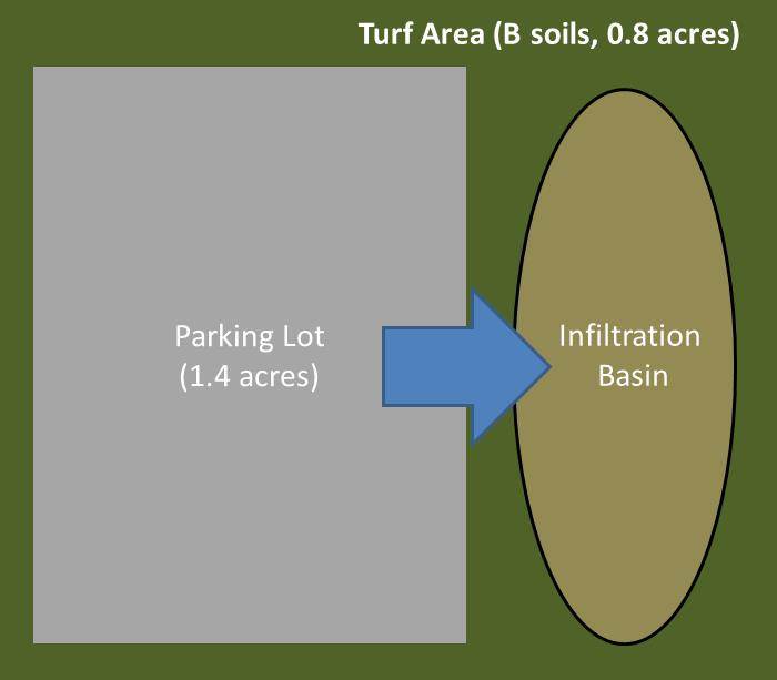 Step 1: Determine the watershed characteristics of your entire site. For this example we have a 2.2 acre site with 1.4 acres of impervious area and 0.8 acres of pervious area in type B soils. The pervious area includes the turf area and the area of the infiltration basin.