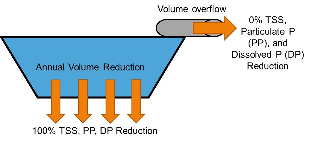 For an infiltration basin system, all stormwater captured by the BMP is infiltrated into the underlying soil between rain events. All pollutants in the infiltrated water are credited as being reduced. Pollutants in the stormwater that bypasses the BMP are not reduced.