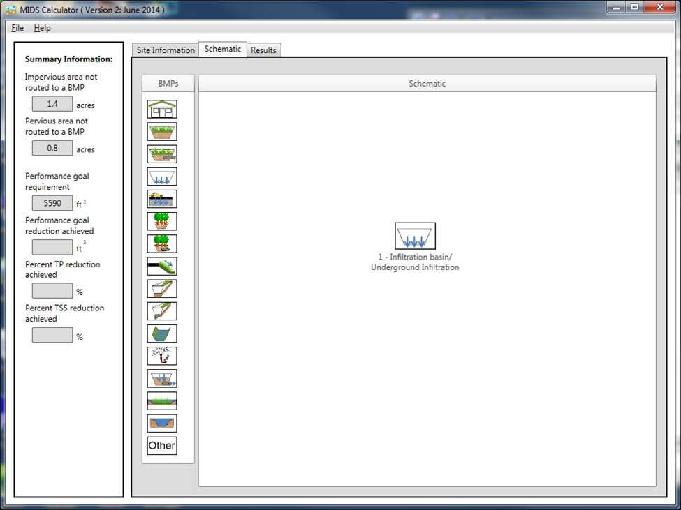 Step 3: Go to the Schematic tab and drag and drop the Infiltration basin/Underground Infiltration icon into the Schematic Window.