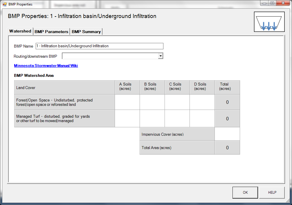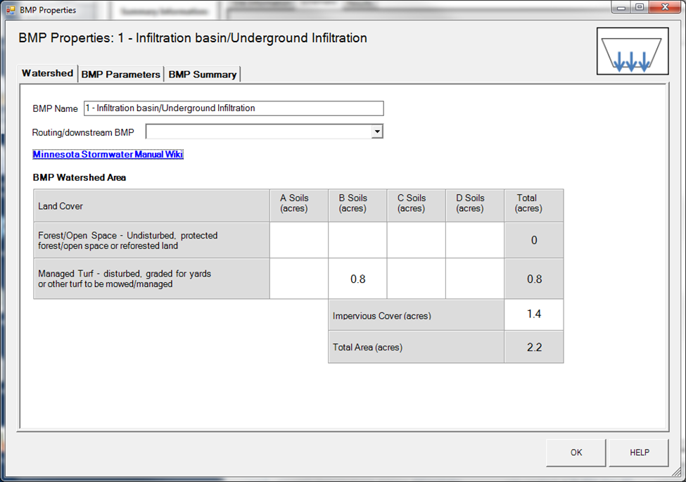 Step 5: If help is needed, click on the Minnesota Stormwater Manual Wiki link or the Help button to review input parameter specifications and calculation specific to the Infiltration basin/Underground infiltration BMP.