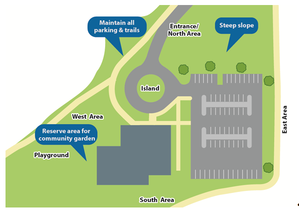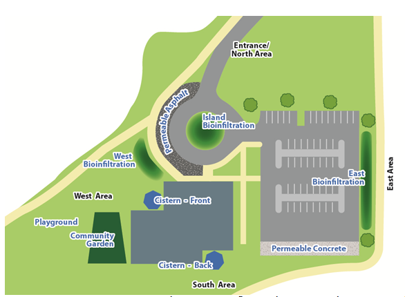 Viable locations for filter BMP placement include all landscape and grass areas adjacent to the parking lot and greenspace south of the building. Limited budget prevents reconstruction of the entire parking lot with permeable pavement; therefore, only the parking stalls are considered for replacement. Cisterns for reuse would be located near the building downspouts, away from building doorways and maintenance areas. The schematic above identifies the specific areas considered for BMPs.
