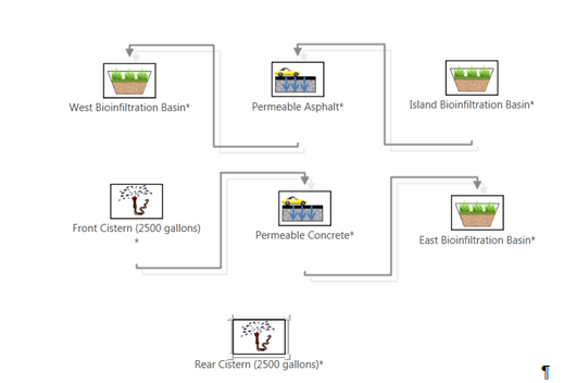 The treatment train as a whole was evaluated using the MIDS calculator. The Island Bioinfiltration Basin excess flow is routed to the permeable asphalt pavement. The permeable asphalt underdrain discharges to the downstream West Bioinfiltration BMP. The Front Cistern overflows to the permeable concrete pavement which contains an underdrain discharging to the East Bioinfiltration Basin. Lastly, the Rear Cistern acts as a standalone BMP. This configuration is shown in the schematic to the right.