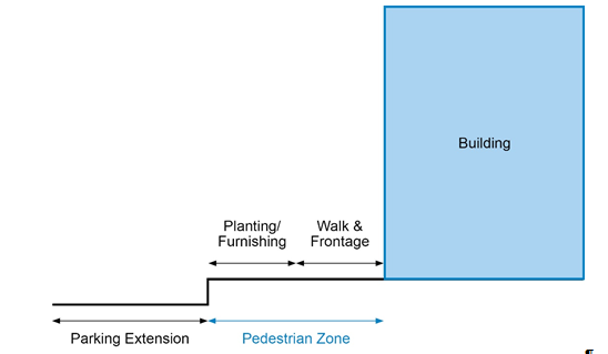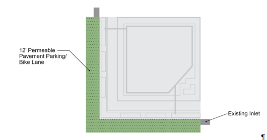 To meet space allotments and reduce degradation due to interaction with people and vehicles, the most viable locations for BMPs are the building rooftop, the pedestrian sidewalk and parking/bike lane. For reference, the street level areas are depicted in the schematic to the right.
