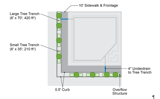 The MIDS calculator also accounts for soil media within the tree trench system, underlying soils, and tree types. As previously stated, Media Mix D is highly recommended for best results with a tree BMP. The selected media mix dictates the MIDS inputs for soil-water storage properties, including a media field capacity of 0.09 cubic feet per cubic foot and a media porosity of 0.31 cubic feet per cubic foot. Although the area’s underlying Hydrologic Soil Group B is relatively well-draining with an infiltration rate of 0.45 inches per hour, high soil compaction was assumed because of the intense urbanization. Therefore an overflow structure was included in the tree trench for larger storm bypass and reduced infiltration capacity over time. The figure to the right displays the overall layout for the tree trench system.