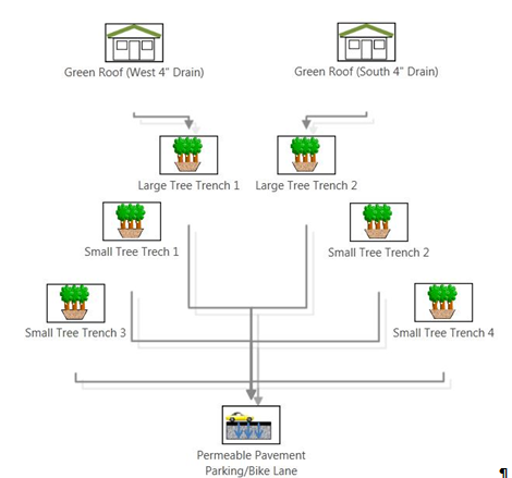 The overall performance of the BMP treatment train was evaluated using the MIDS calculator. The treatment train configuration consisting of a green roof, 2 large tree trenches, 4 small tree trenches and a permeable pavement parking/bike lane is shown on the right.