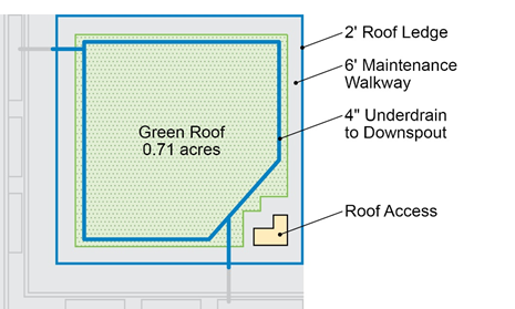 For this setting, space was allotted for a 6 foot walkway around the perimeter of the green roof to provide maintenance access to the BMP without hindering its functionality and the performance. To route excess water to the downstream BMPs on the south and west side of the building, two 4-inch downspouts were included. Two downspouts reduce the risk of clogging and provides an extra outlet for water if one downspout is undergoing maintenance. A schematic of the green roof design is shown to the right.