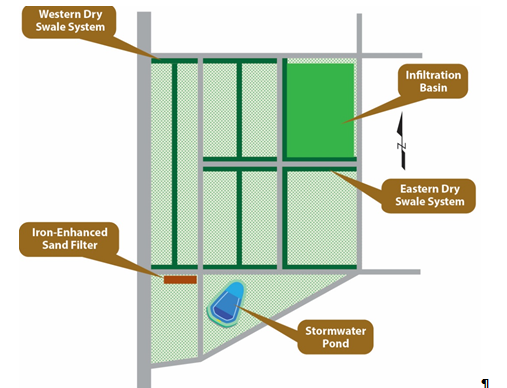 The varied BMP approach consists of an infiltration trench, a dry swale system with underdrains, an iron-enhanced sand filter, and a stormwater pond, as shown in the schematic to the right. This treatment train was able to significantly reduce pollutant loadings, most significantly by infiltration of a large portion of runoff through the BMPs. This treatment train achieved removal efficiencies of 86 percent for runoff volume, 86 percent for total phosphorous, and 86 percent for total suspended solids.