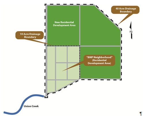 This scenario is for a new commercial/residential development in an agricultural area adjacent to a rural town. Current land use consists of row crop agriculture. Several buildings are located near the southern portion of the area and it is known that vehicle fueling and pesticide storage and handling occurred in this area. The new development is to be 40 acres consisting of four 10-acre sub-neighborhoods. The upstream neighborhoods have slopes of 2 percent draining to the downstream southwest neighborhood, hereby referred to as the “BMP Neighborhood.” At the southwest corner of the BMP Neighborhood is an outlet to Union Creek, which continues southwest to a small lake. This lake is known to be nutrient impaired with excess levels of phosphorus, possibly due to fertilizer use from upstream agricultural areas.