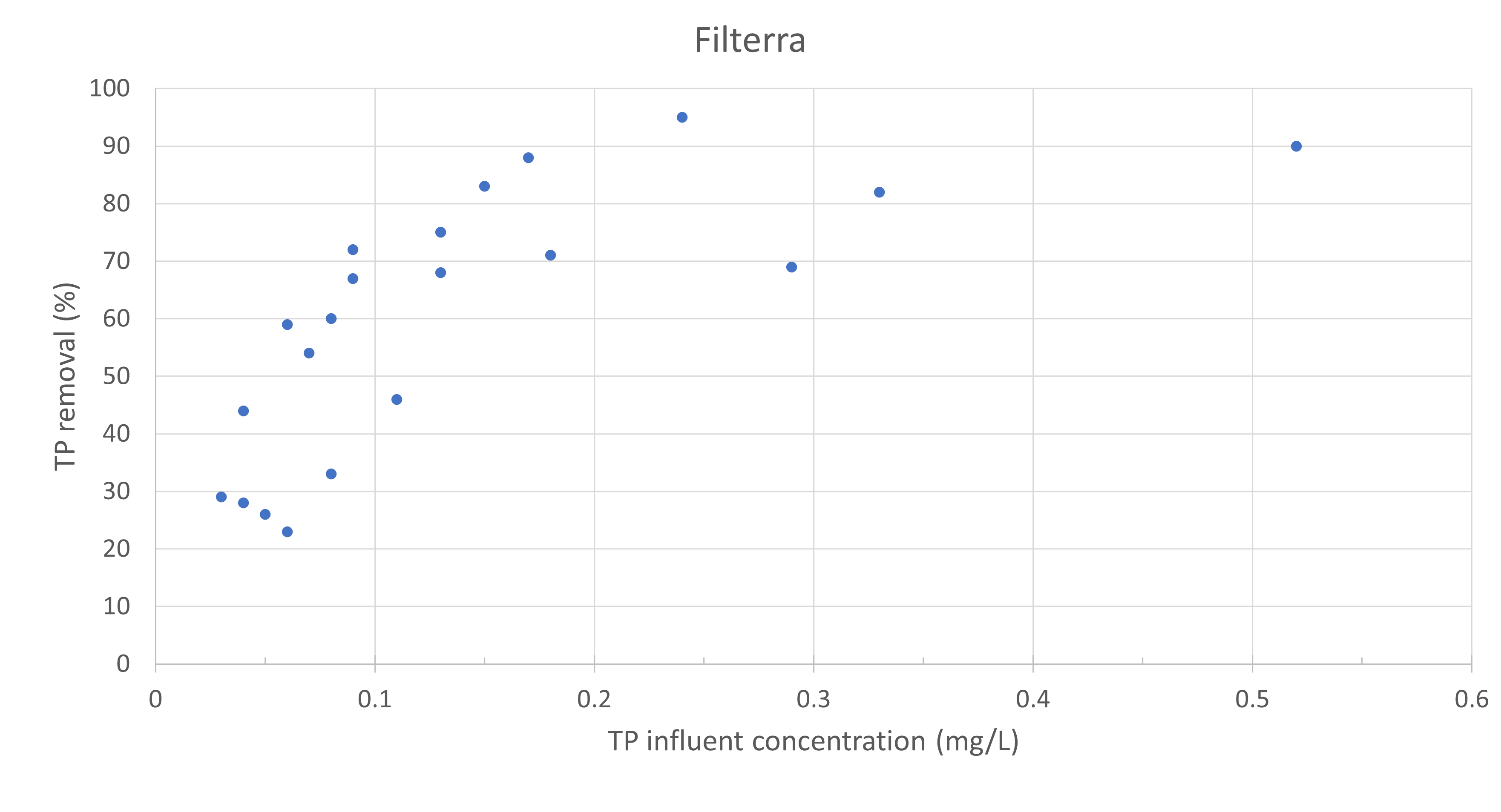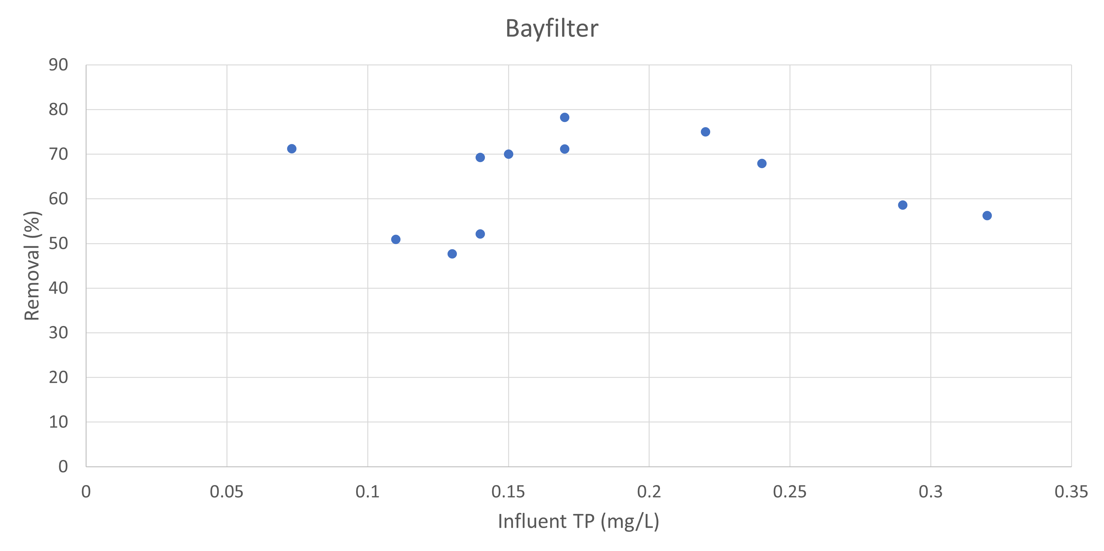 Phosphorus removal by a filtration or sedimentation practice varies with TP concentration in runoff, the fraction of phosphorus in particulate form, and preferential retention of particles.