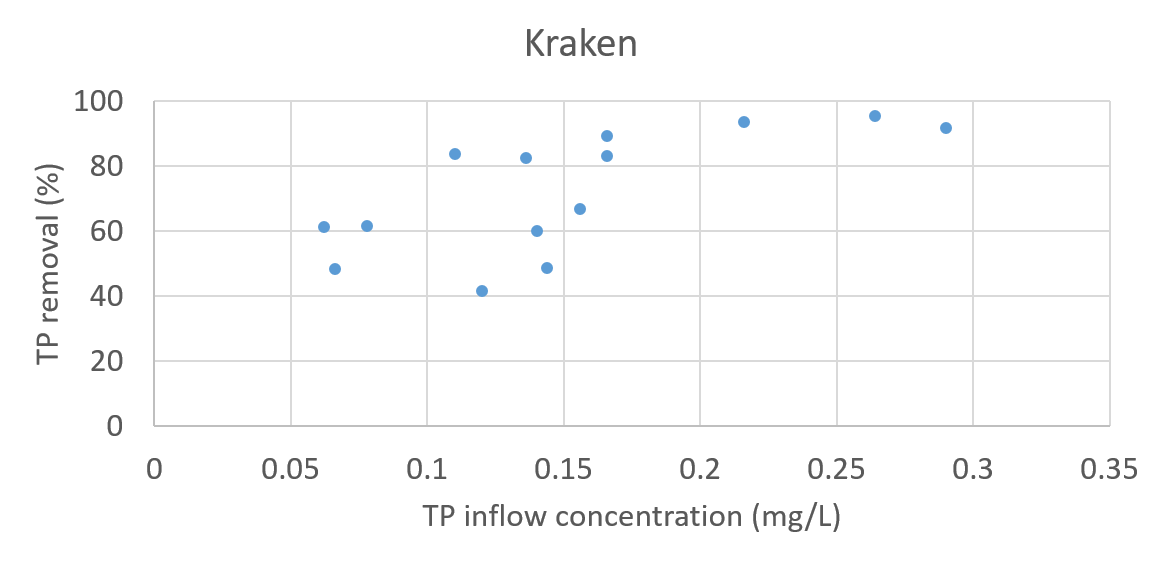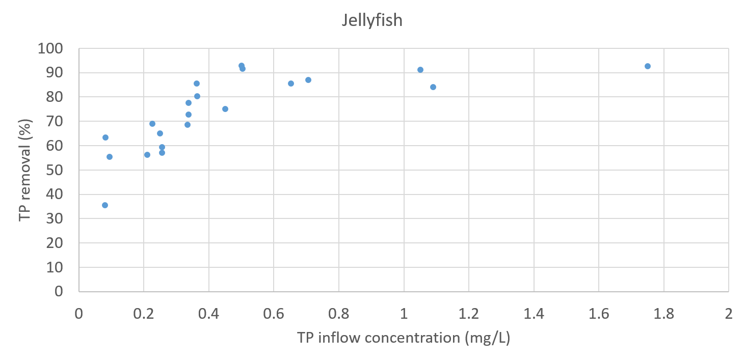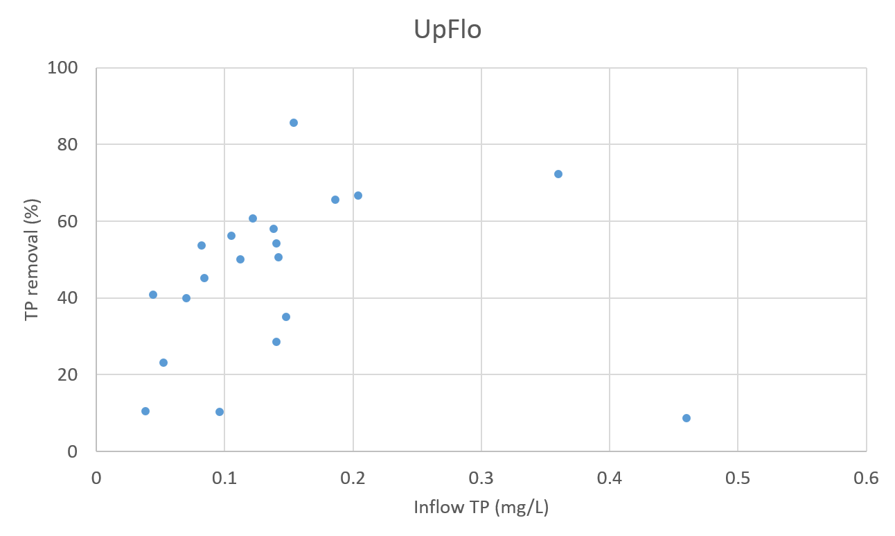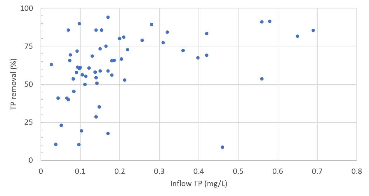 The adjacent image shows TP removal for devices as a function of influent TP concentrations. TP removal decreases as influent concentration decreases below 0.1 mg/L. There is considerable scatter in the data and some indication that TP removal begins to diminish at influent concentrations below 0.2 mg/L.