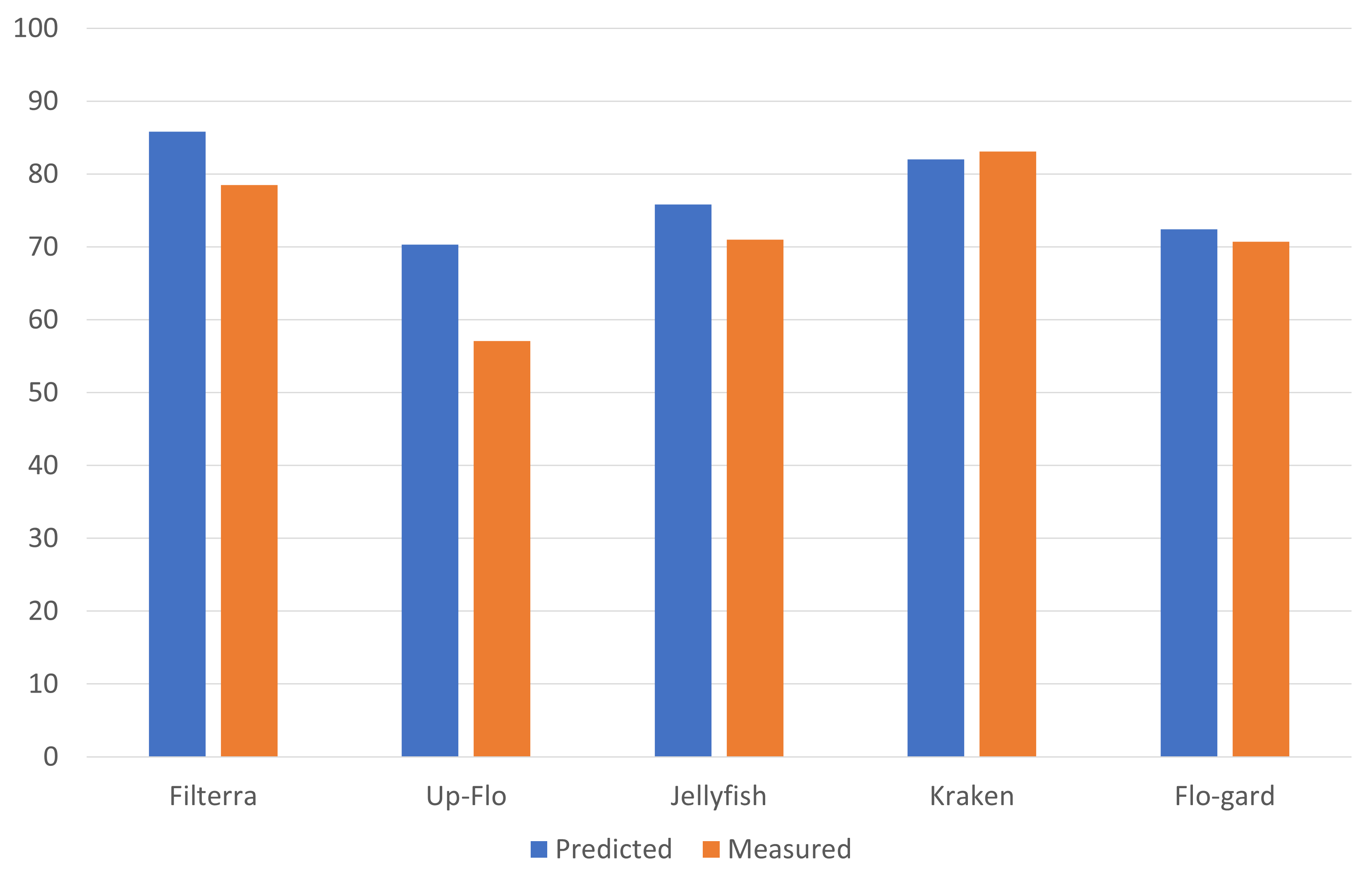 - Up-Flo Filter w/Filter Ribbons: The TAPE approval document noted the small median particle size (11 microns) in runoff to the device, citing multiple times when the device became clogged and required maintenance: "The system was subjected to atypical sediment loading and needed to be serviced after 4 months, or 12.7% of a water year. Monitoring personnel observed similar sediment loading and blinding issues with other systems evaluated at the Test Facility. The runoff from the Test Facility is not expected to be characteristic of other urban runoff applications". Laboratory testing for both the TAPE and NJCAT programs indicated removal rates exceeding 50%.