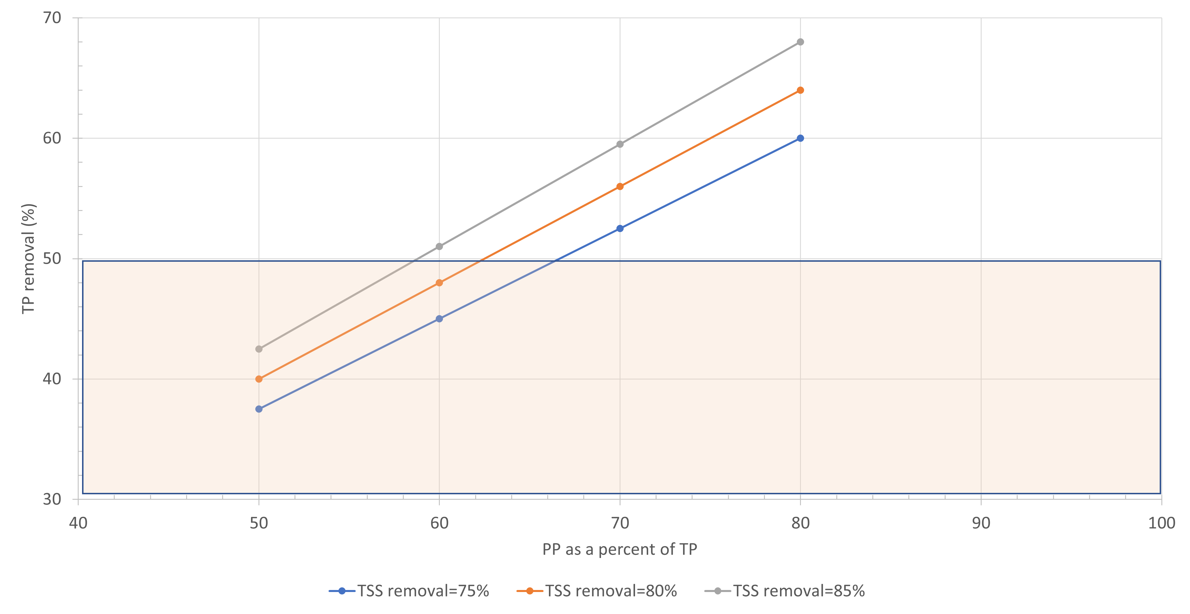 These removal percentages are based on the assumption that particulate phosphorus accounts for 55% of TP. If PP accounted for 75% of TP, the removal values would be as follows.