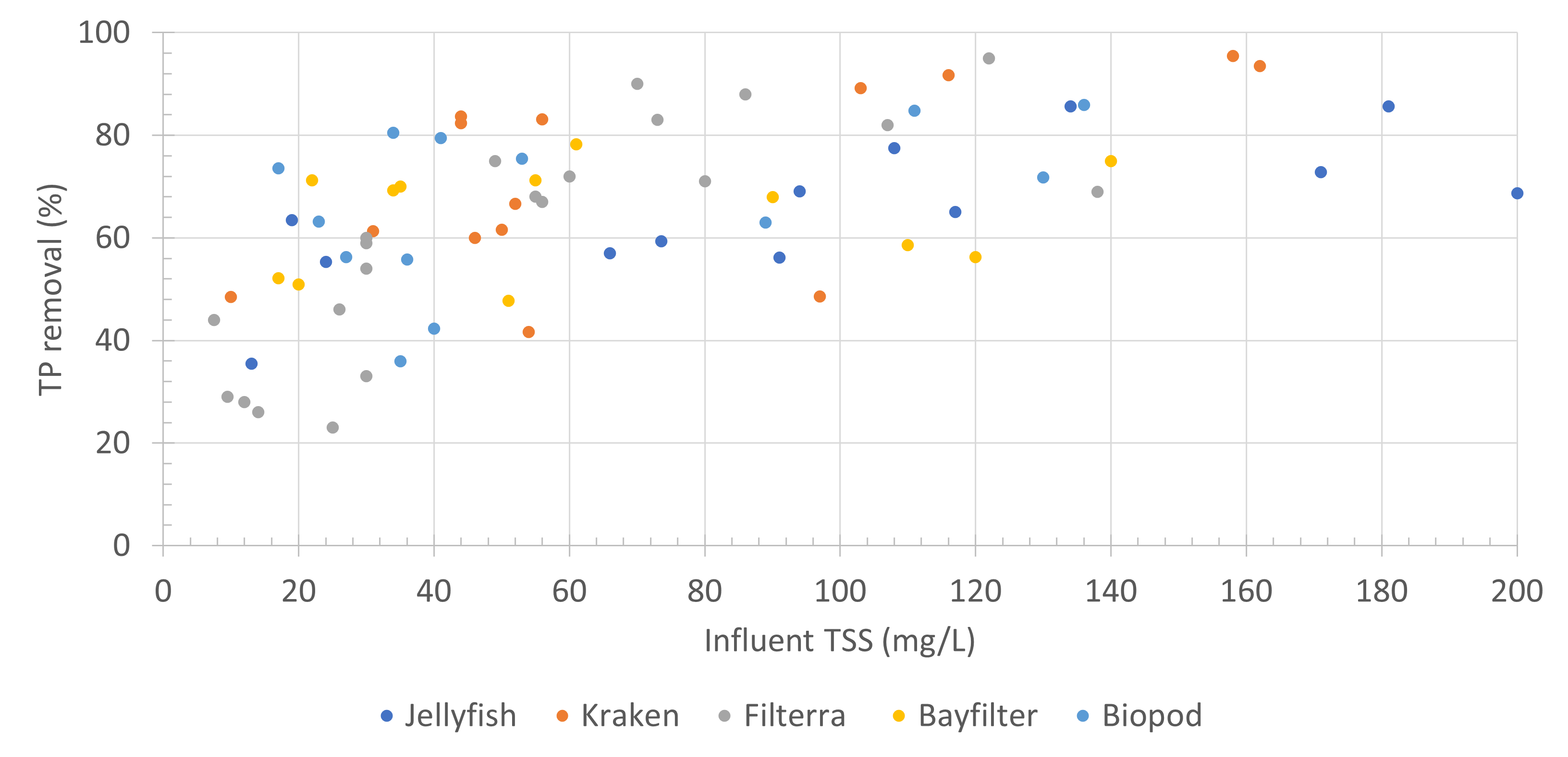 | Manufactured treatment device | Median inflow TP (mg/L) | Median inflow TSS (mg/L) | TP Removal (%) | TSS removal (%) | |||||||||