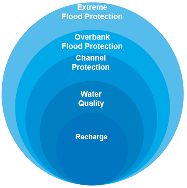 The goal of stormwater management is to provide effective control over each management zone in order to produce post-development hydrology that most closely resembles state or locally defined pre-development conditions at the development site. Each criterion defines a unique storage volume that should be managed at the site. They are best understood visually as a layer cake that has progressively larger layers from bottom to top, with recharge volume being the narrowest layer at the bottom and extreme storm control comprising the thickest layer at the top.