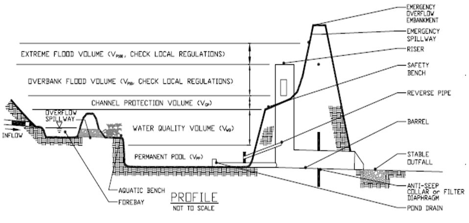 | Total Storage Volume (Vts) | For ponds built under the requirements of the CGP, the total storage volume required is the sum of the permanent pool volume (Vpp) plus the water quality volume (Vwq). |